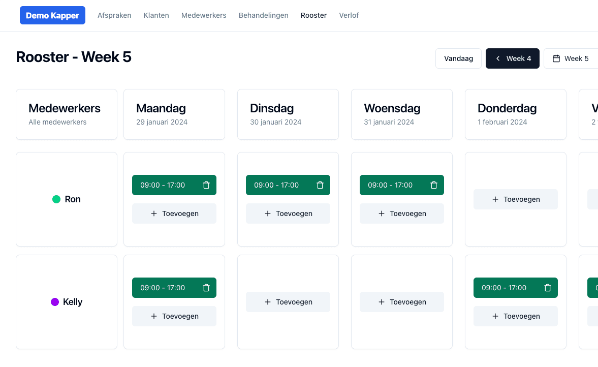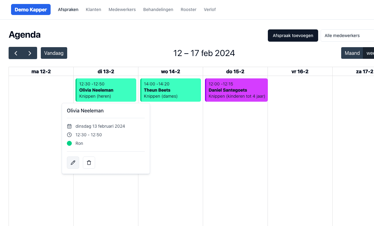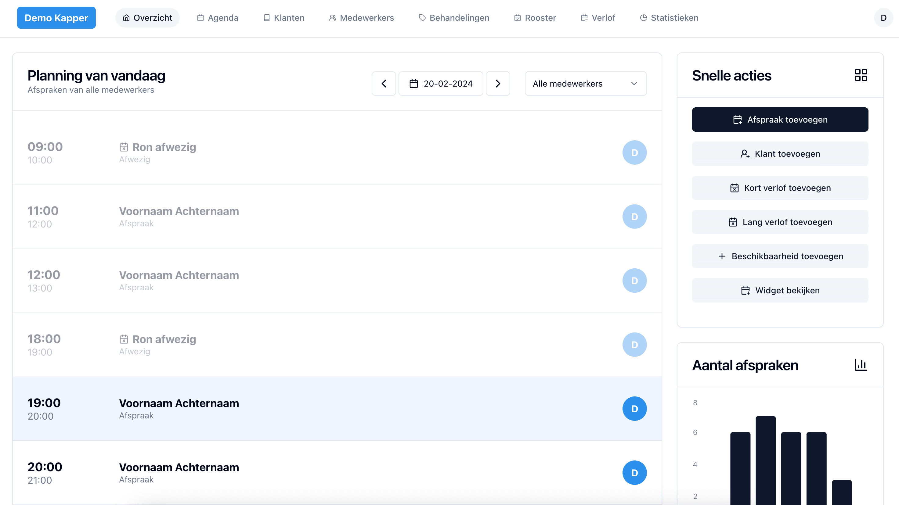 Bekijk en beheer in één oogopslag alle afspraken per medewerker of voor het hele bedrijf.